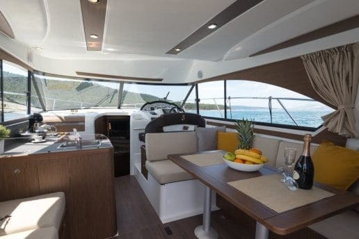 The large L-shaped galley faces the saloon. A choice of additional storage spaces or another seat can be fitted as a continuation of the galley.
