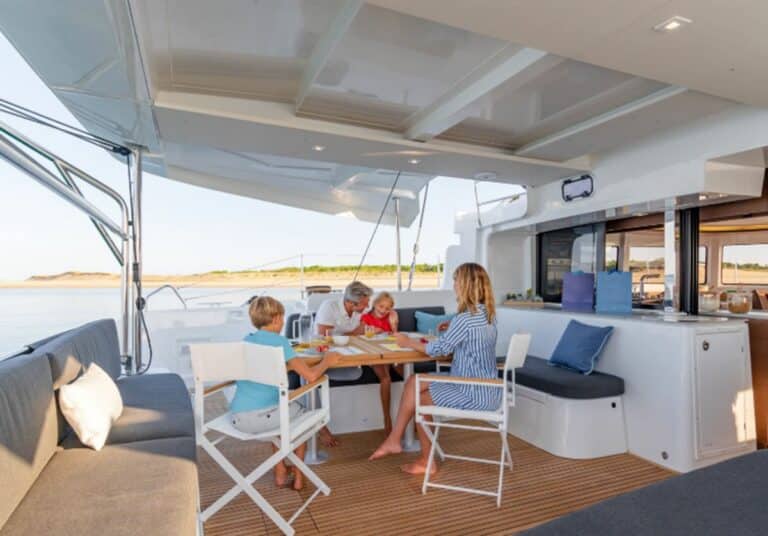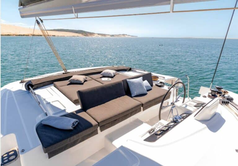 On catamarans of this size, the dinghy hoist system is usually a simple offer. On this 46 it is possible to choose either a classic stainless steel davits or an electrical hydraulic platform. This last option offers an easier access to the water while offering a new living space at the back of the boat.