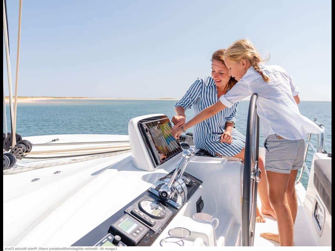 On catamarans of this size, the dinghy hoist system is usually a simple offer. On this 46 it is possible to choose either a classic stainless steel davits or an electrical hydraulic platform. This last option offers an easier access to the water while offering a new living space at the back of the boat.