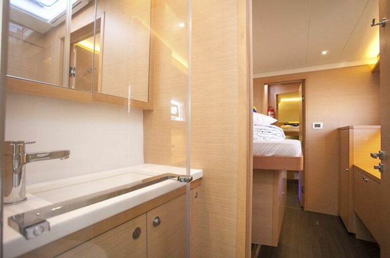 At the stern there is also a hydraulic platform with space for tender boat – 40 HP RIB for fun, watersports and easy transfers when at anchor. All the equipment mentioned make wild, hidden bays with crystal clear water a “natural habitat” for Lagoon 52 Fly, while draught of only 1,55 meters allows access to shoals. On the open sea agile sailing is ensured with 156 square meters of sail area. At the same time mast position more to the aft provides better overall balance, improved performance and easier control under sails.