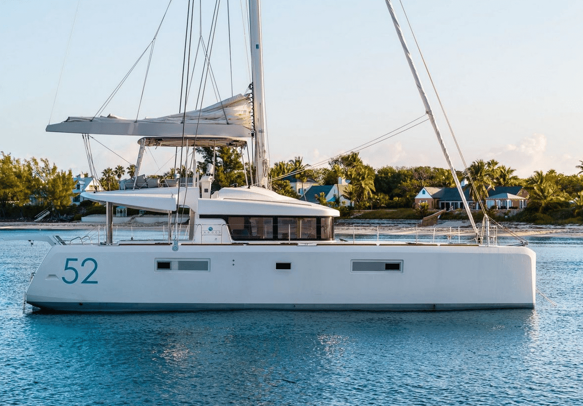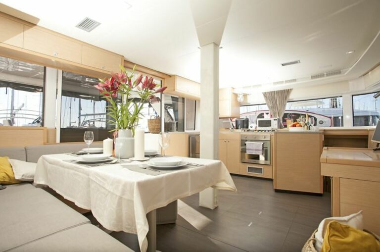Lagoon 52 Fly – Modern and elegant appearance of Lagoon 52 Fly together with its outstanding features is a result of joint work of renowned parties: VPLP studio for naval architecture, Nauta Design agency for interior and Patrick le Quément for interior design. Overall style is contemporary and instant-recognizable as a distinct Lagoon signature, while one exceptional detail stands out – diamond-shaped vertical bows.
