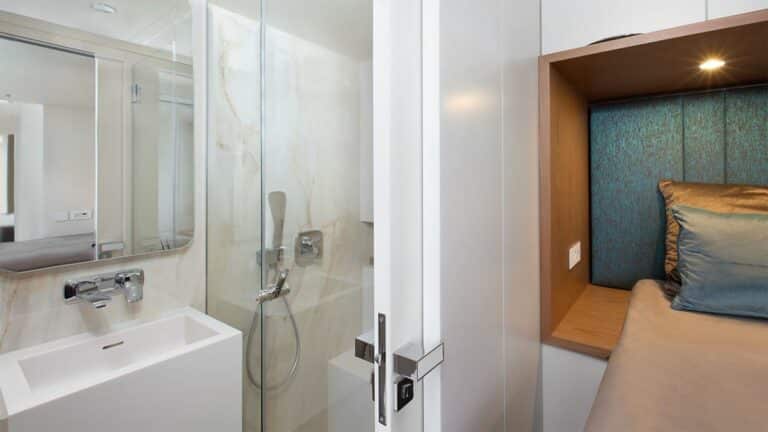 The hulls provide impressive volumes to set up a custom layout including airy, luxurious guest cabins and an opulent master suite with a walk-in dressing, desk, sofa, retractable TV and an immense bathroom. A perfect setting to unwind and relax after a long day in the sun.